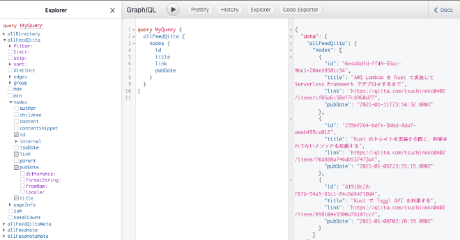 yarn developで開発サーバを立ち上げ直し、GraphQL の画面http://localhost:8000/_graphqlを表示します。 - Qiita に関する項目と note に関する項目が増えていることがわかります。