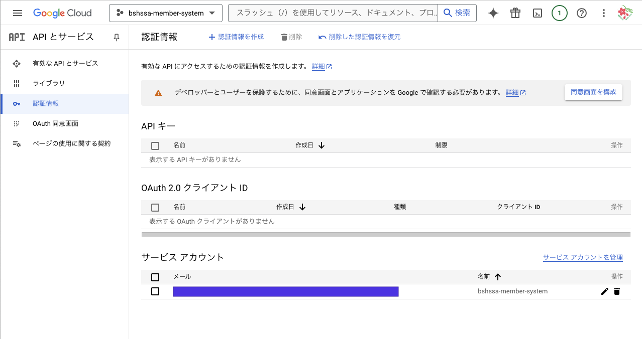 再度、「API とサービス」の画面に戻り、「認証情報」を選択。先ほど作成したサービスアカウントを選択する。